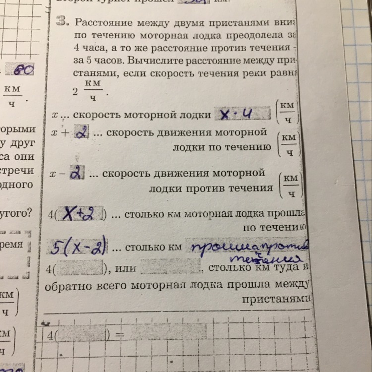 4(х+2)или 5(х-2) столько км туда или обратно всего моторная лодка прошла между пристанями