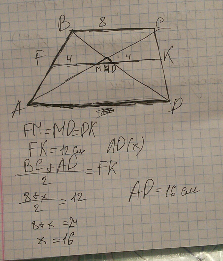 середня лінія трапеції ділиться діагоналями на 3 рівні відрізки ,знайдіть більшу основу трапеції якщо її менша основа =8 см