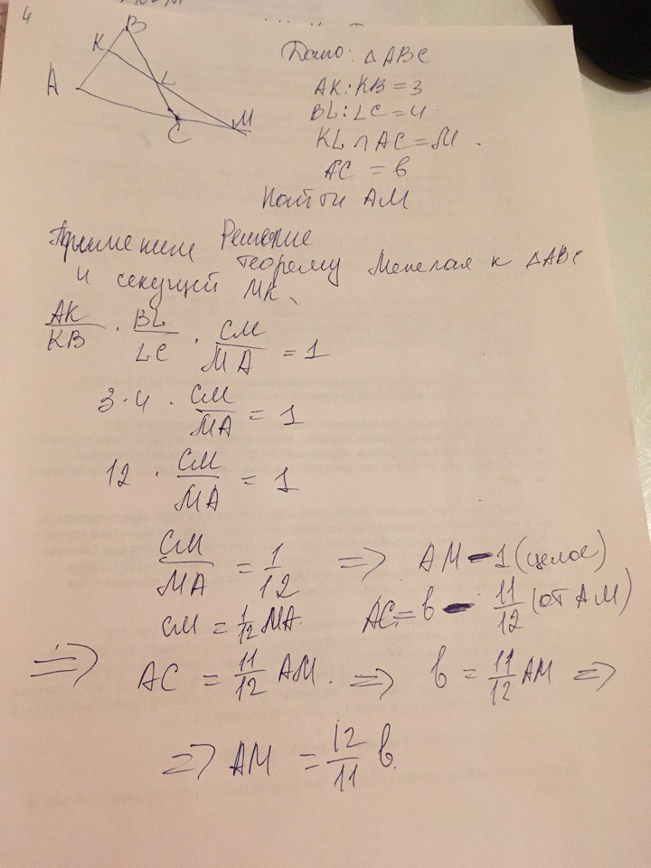 На сторонах AB и BC треугольника ABC взяты точки K и L так, что AK:KB=3, BL:LC=4. Прямая KL пересекает AC в точке M. Найдите AM, если AC=b