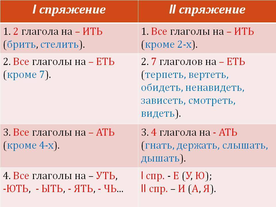 Ко II спряжению относятся: – глаголы в неопределённой форме оканчивающиеся на -ить (кроме брить, стелить); – 7 глаголов на -еть: смотреть, видеть, ненавидеть, зависеть, терпеть, обидеть, вертеть; – 4 глагола на -ать: слышать, дышать, гнать, держать, а также все приставочные глаголы, образованные от них.