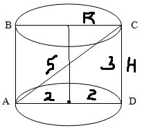 Радиус основ цилиндра 2 см, а диагональ осевого сечения 5 см.