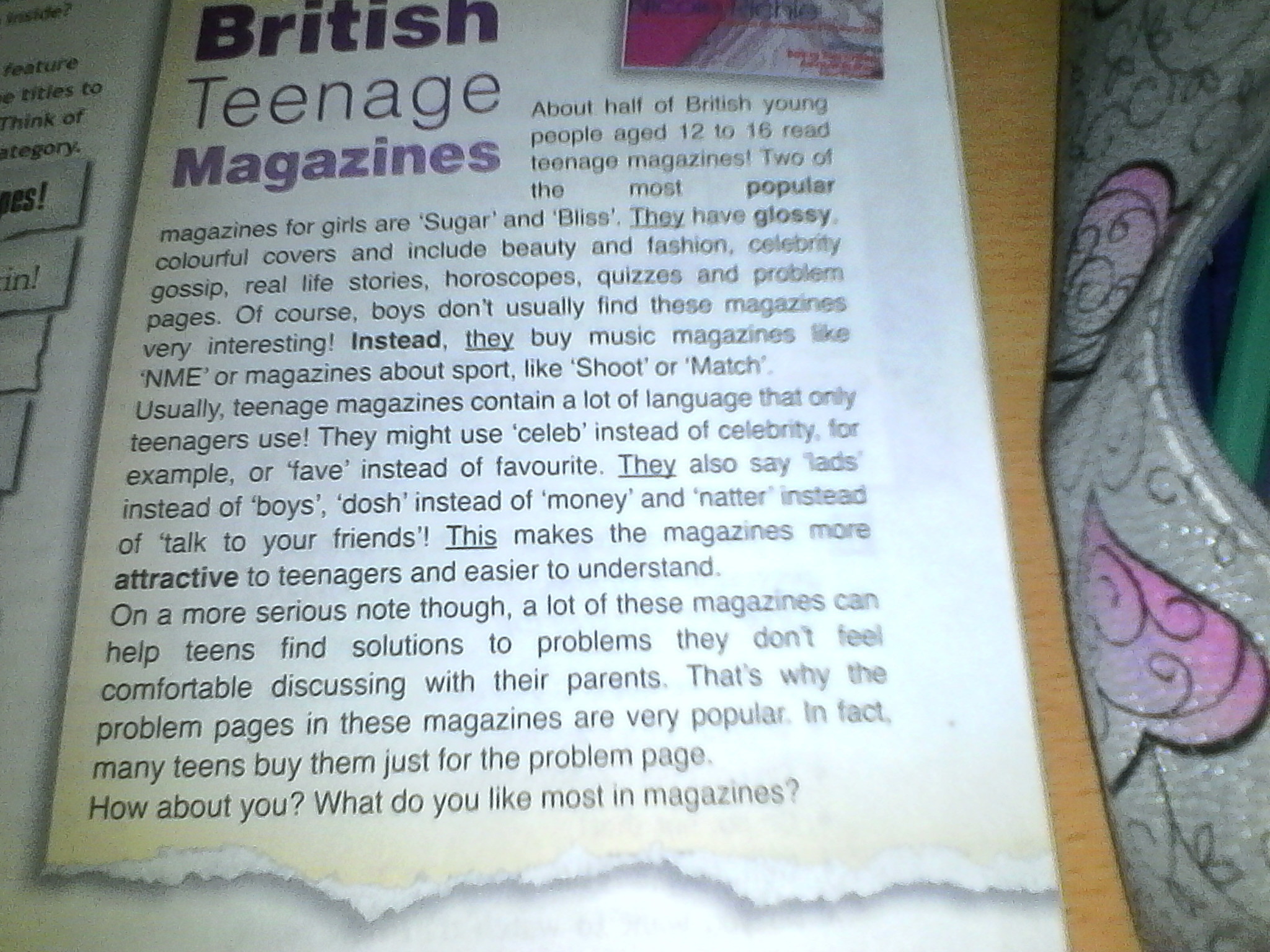 Около половины молодых людей Британии в возрасте от 12 до 16 лет читают подростковые журналы. Два самых популярных журнала для девочек-это "Шуга" и "Блисс". В них есть глянцевые и разноцветные обложки, в них идет речь о красоте и моде, сплетнях о звездах, реальных жизненных историях, гороскопах, квизах(викторины) и решениях проблем.
