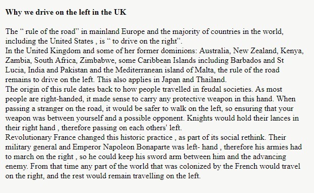 Почему мы едем на левой в Великобритании "правило дороги" в континентальной Европе и большинстве стран мира, включая США, является "ездить на права". В Соединенном Королевстве, и некоторые из ее бывшие доминионы: Австралия, Новая Зеландия, Кения, Замбия, Южная Африка, Зимбабве, некоторые Карибские острова Барбадос в том числе и Сент-Люсия, Индии и Пакистана и средиземноморском острове Мальта, верховенство дороге остается левостороннее. Это также относится и в Японии и Таиланде. Происхождение этого правила относится к тому, как люди путешествовали в феодальных обществах. Как большинство людей правой руки, это имело смысл проводить защитную оружие в этой руке. При прохождении незнакомца на дороге, было бы безопаснее ходить слева, так что ваш обеспечения оружием был между вами и возможного противника. Рыцари будут иметь свои копья на правую руку их, поэтому проходя слева от друг друга. Революционная Франция изменила эту историческую практику, как часть своей социальной переосмысления. Их военный генерал и император Наполеон Бонапарт был левша, поэтому его армии пришлось идти на право, так что он может держать его руку с мечом между ним и наступающего противника. С этого времени любой части мира, которая была колонизирована французами будет путешествовать по праву, а остальные останутся путешествия слева.