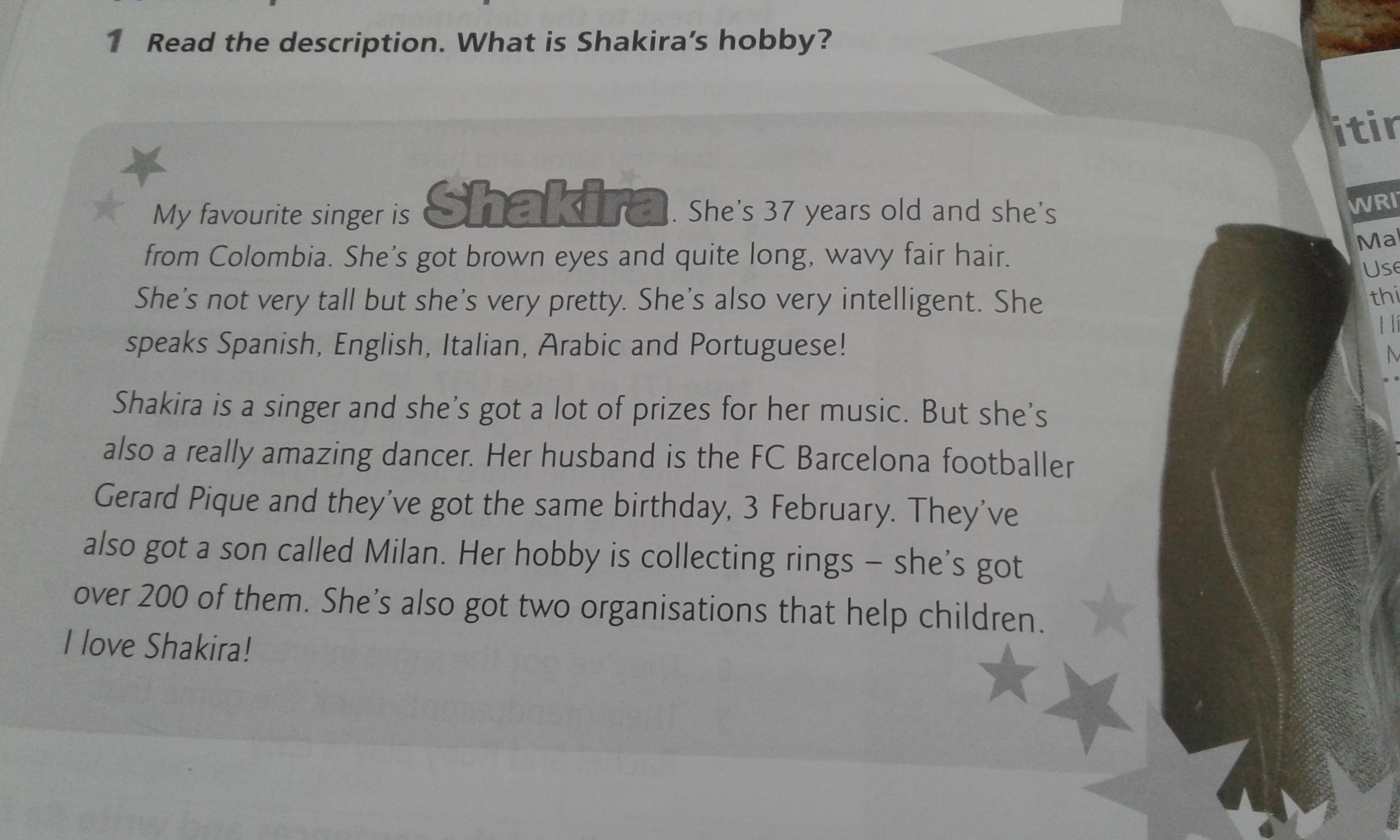 1 Прочтите описание. Что такое хобби Шакиры? Моя певица favounte - SdialHIa ей 37 лет, и она из Колумбии. У нее карие глаза и довольно длинные волнистые светлые волосы. Она не очень высокая, но она очень красивая. Она тоже очень умная. Она говорит по-испански, по-английски. Итальянский, Арабский и Португальский! Шакира - певец, и у нее много призов за ее музыку. Но она тоже потрясающая танцовщица. Ее муж - футболист ФК «Барселона» Жерар Пике, и у них такой же день рождения. 3 февраля. У них также появился сын под названием Милан. Ее хобби собирает кольца, у которых более 200 из них. У нее также есть две организации, которые помогают детям. люблю Шакиру! 3AKPblTb
