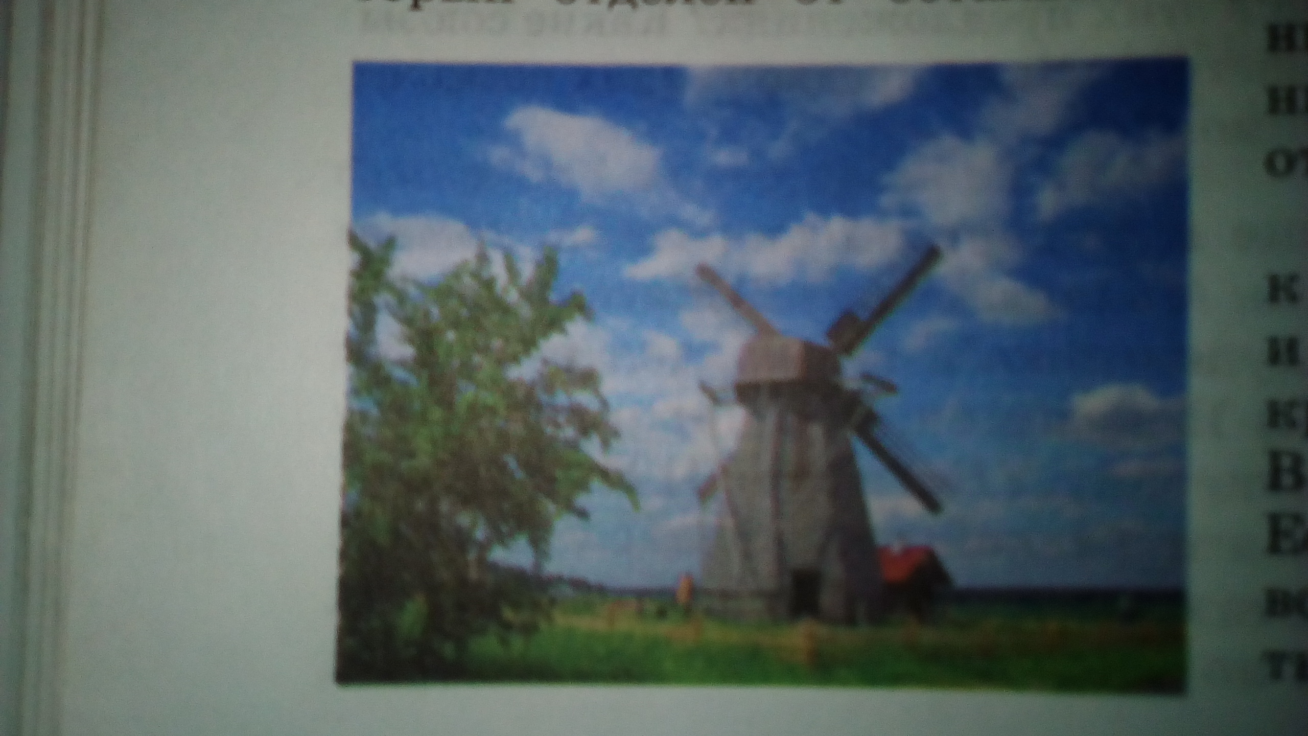 На этой картинке изображен теплый , летний день . На переднем плане мы видим дерево ,которое колышется на легком ветру . На заднем плане мы видим мельницу . Мельница очень высокая и сзади нее стоят домики с красными крышами . Небо голубое и по нему плавно плывут облака.