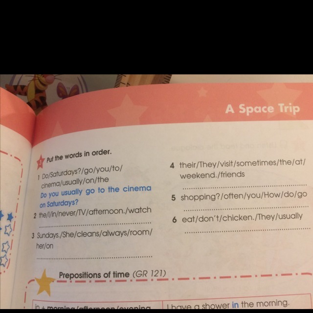 2 I never watch TV in the afternoon. 3 She always cleans her room on Sundays. 4 They sometimes visit their friends at the weekend . 5 How do you often go shopping? 6 They usually don’t eat chicken