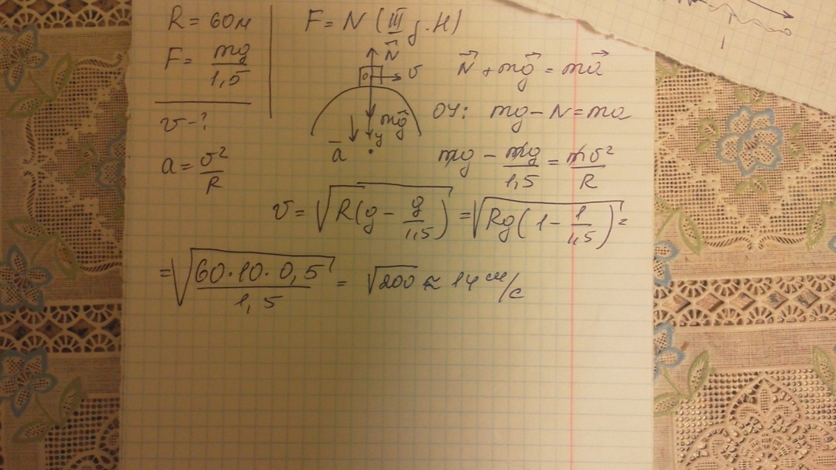 автомобиль проходит выпуклый мост с радиусом кривизны 60 м.Сила давления автомобиля на мост в его верхней точке в 1,5 раза меньше силы тяжести автомобиля.Какова скорость автомобиля в верхней точке моста