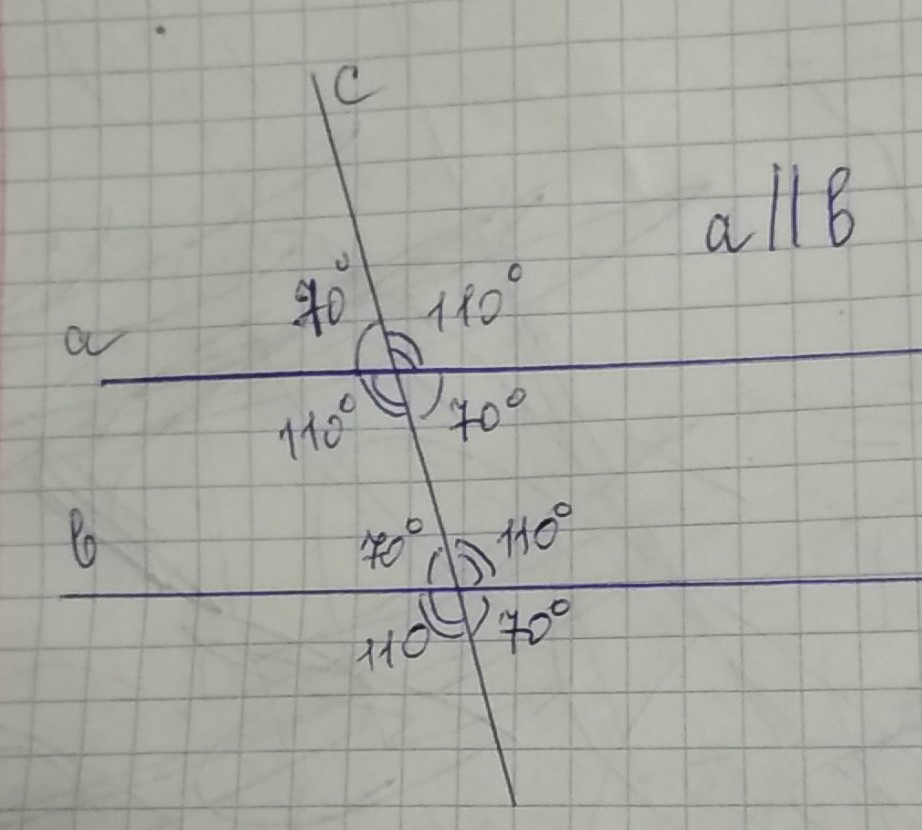 Один из углов образованных при пересечении двух паралельных прямых и секущей равен 70°.Найти остальные углы.