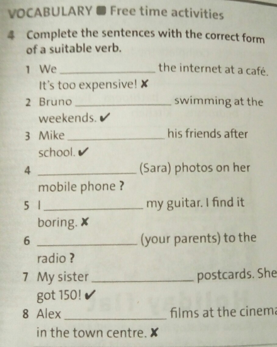 1)use2)is3)meets4)I see5)love6)I listened 7)buy 8)see