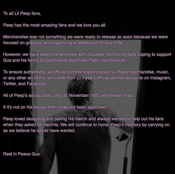 Для всех поклонников Lil Peep у Peep самые замечательные фанаты, и мы любим всех вас. Merchandise не был тем, что мы были готовы выпустить так скоро, потому что мы были сосредоточены на скорби и хвалили празднование жизни Гауса. Тем не менее, мы были поражены просьбами любящих фанатов, которые надеялись поддержать Гуса и его семью, купив законный товар Peep. Чтобы гарантировать подлинность, все официальные сообщения о товарах, музыке или других формах искусства LI Peep будут поступать из официальных подтвержденных счетов L Peeps на Instagram, Twitter и Facebook. Все социальные должности Пипа, до 16 ноября, останутся нетронутыми. Если это не на его социуме, тогда он не был одобрен. Пип любил разрабатывать и продавать свой товар и всегда хотел помочь своим поклонникам, когда они попросили перепечатки. Мы будем продолжать уважать память Пипа, продолжая, как мы полагаем, он бы хотел. Отдых в мире Гас