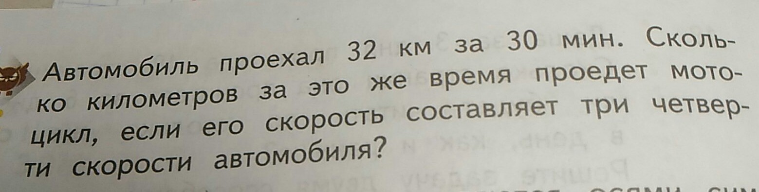 Скорость автомобиля 32/30 км/мин.Скорость мотоцикла 32/30*3/4=0,8 км/мин.