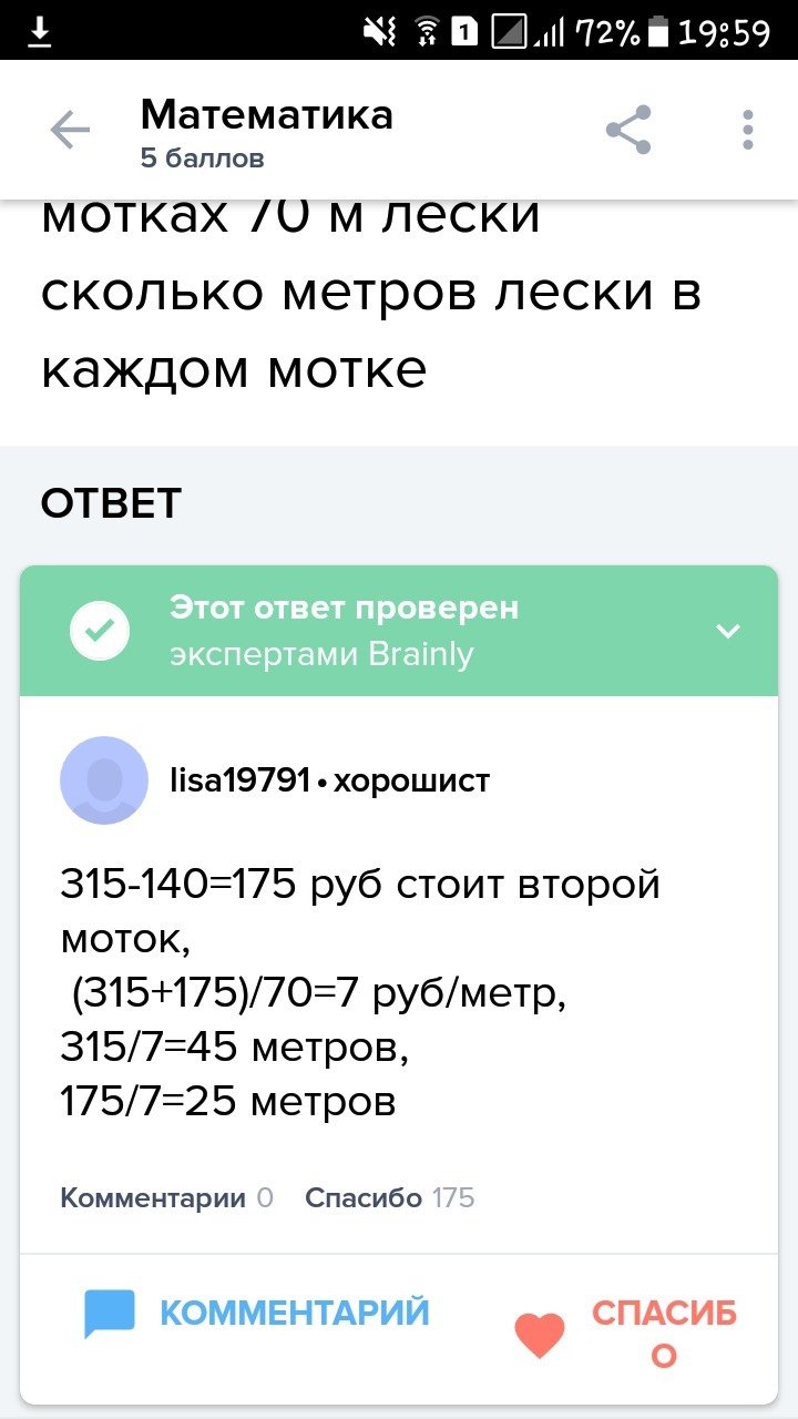 Один моток лески для удочки стоит 315 р.,другой такой же моток стоит на 140 р., дешевле.В этих двух мотках 70 м.,лески.Сколько метров лески в каждом мотке