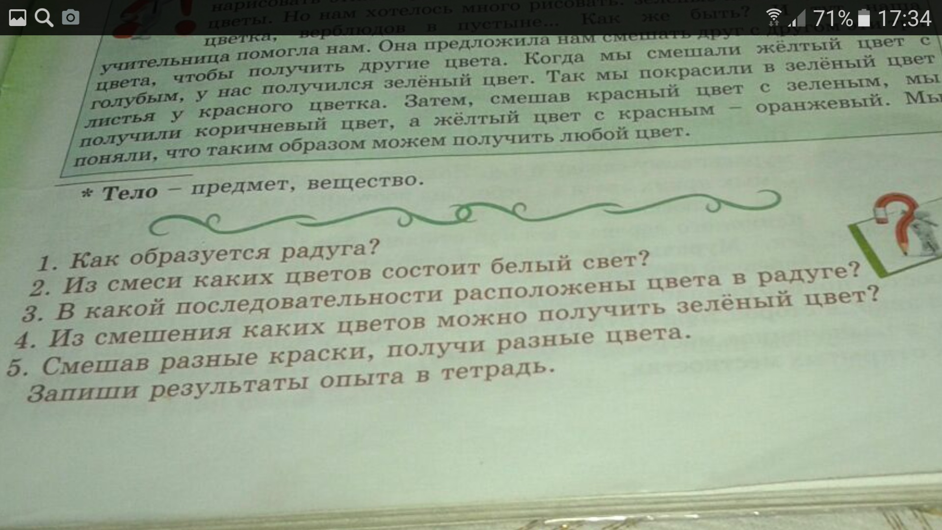 5. Пиши так: "Если смешать красный + зелёный получится жёлтый. Если смешать синий + красный будет фиолетовый. А синий + зелёный голубой.