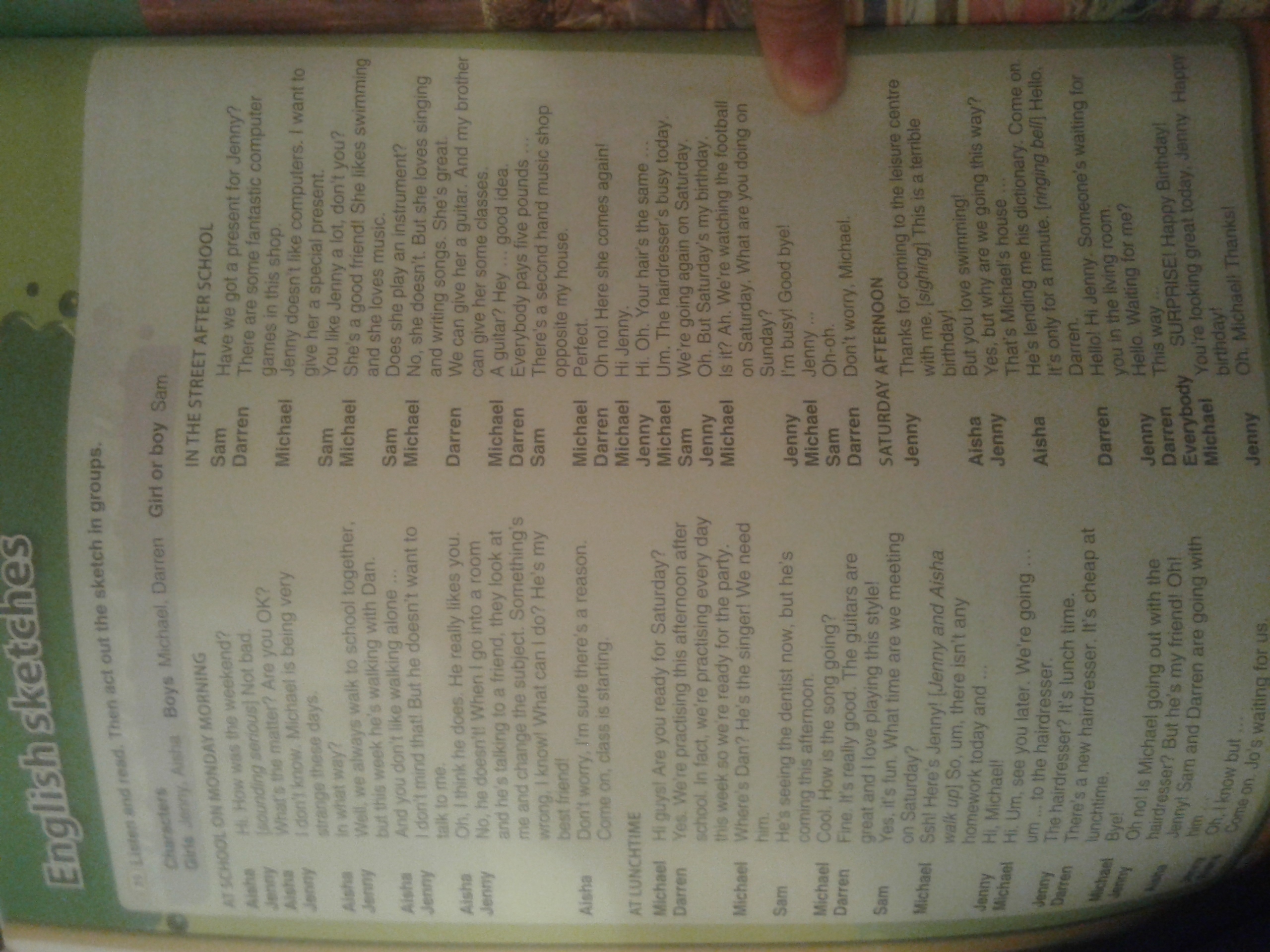 М: - Тише, здесь Дженни! *Дженни и Айша подходят* Ну, что же, сегодня совсем нет домашней работы, и...