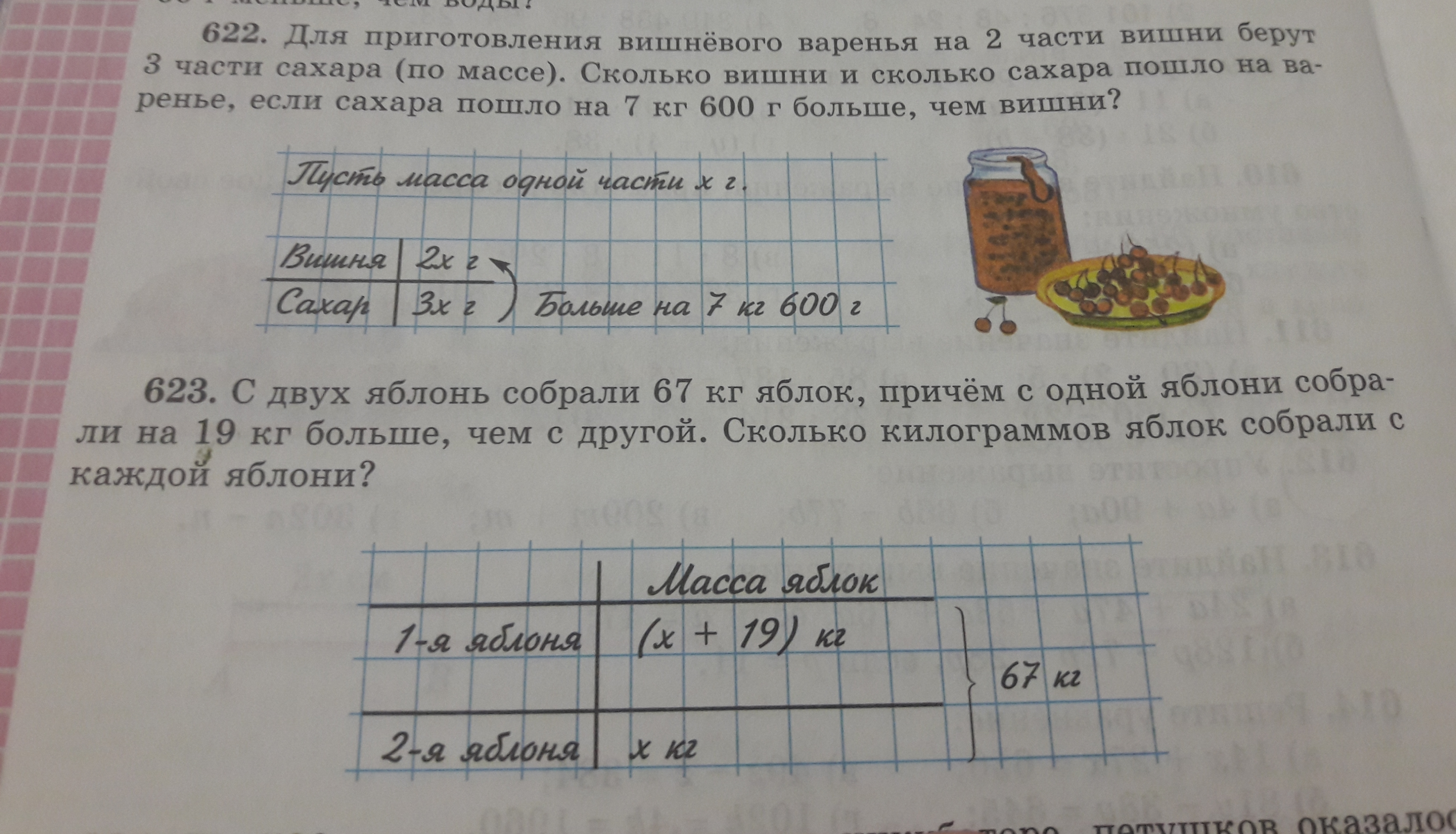 Первая задача НОМЕР 622:1) 7 кг 600 г=7 600(г) 2)3x-2x=7600 3)7600/3=22 800(г) 4) 7600/2=15 200(г) Ответ:сахар 22800 г,а вишни 15 200 г.