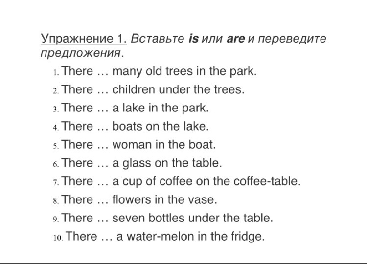 1 в парке много старых деревьев.2под деревьями дети. 3 в парке есть озеро4на озере есть лодки5 в лодке есть женщина 6 на столе стоит стакан7 на кофейном столике стоит чашка кофе8 в вазе есть цветы9под столом семь бутылок 10 в холодильнике есть арбуз