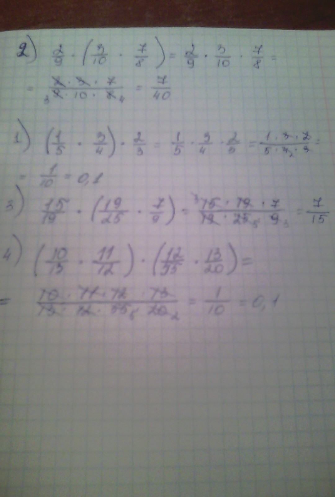 Вычесление наиболее удобным способом, применяя свойства умножения: 1) (1/5 × 3/4) × 2/3 2) 2/9 ×(3/10×7/8) 3) 15/19 × (19/25×7/9)×5/7 4) (10/13 × 11/12) × (12/55×13/20). P.S-кто поможет дам 20 баллов и получит лайк, звание "ЛУЧШИЙ ОТВЕТ"