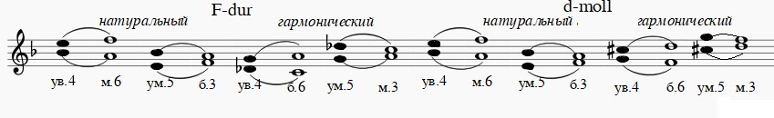 К тритонам относятся увеличенная кварта и уменьшённая квинта. Тритоны - это диссонирующие интервалы, качественная величина которых, исходя из названия, составляет три тона (или шесть полутонов). В каждой тональности есть две пары тритонов: два в натуральном и два в гармоническом виде. Напомню, что в мажоре гармонического вида понижается VI ступень (в F-dur это ре♭), а в миноре гармонического вида повышается VII ступень (в d-moll это до♯).