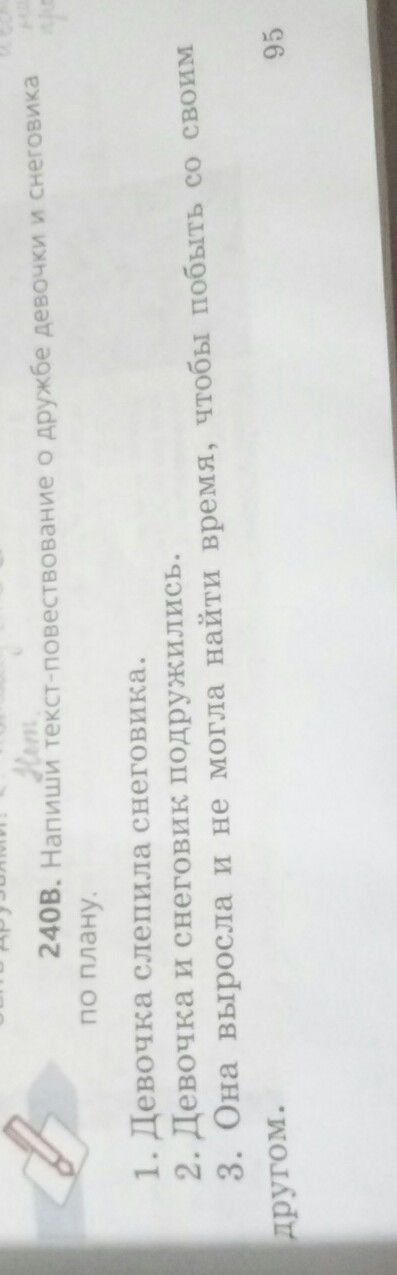 напишите текст повествование о дружбе девочки и снеговика по плану.Помогите пожайлуйста! Срочно!!