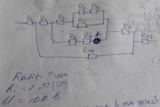 Какие показания будут у апмерметра на определенном участке цепи (отметила его)? Все сопротивления резисторов по 1Ом, напряжение 100В