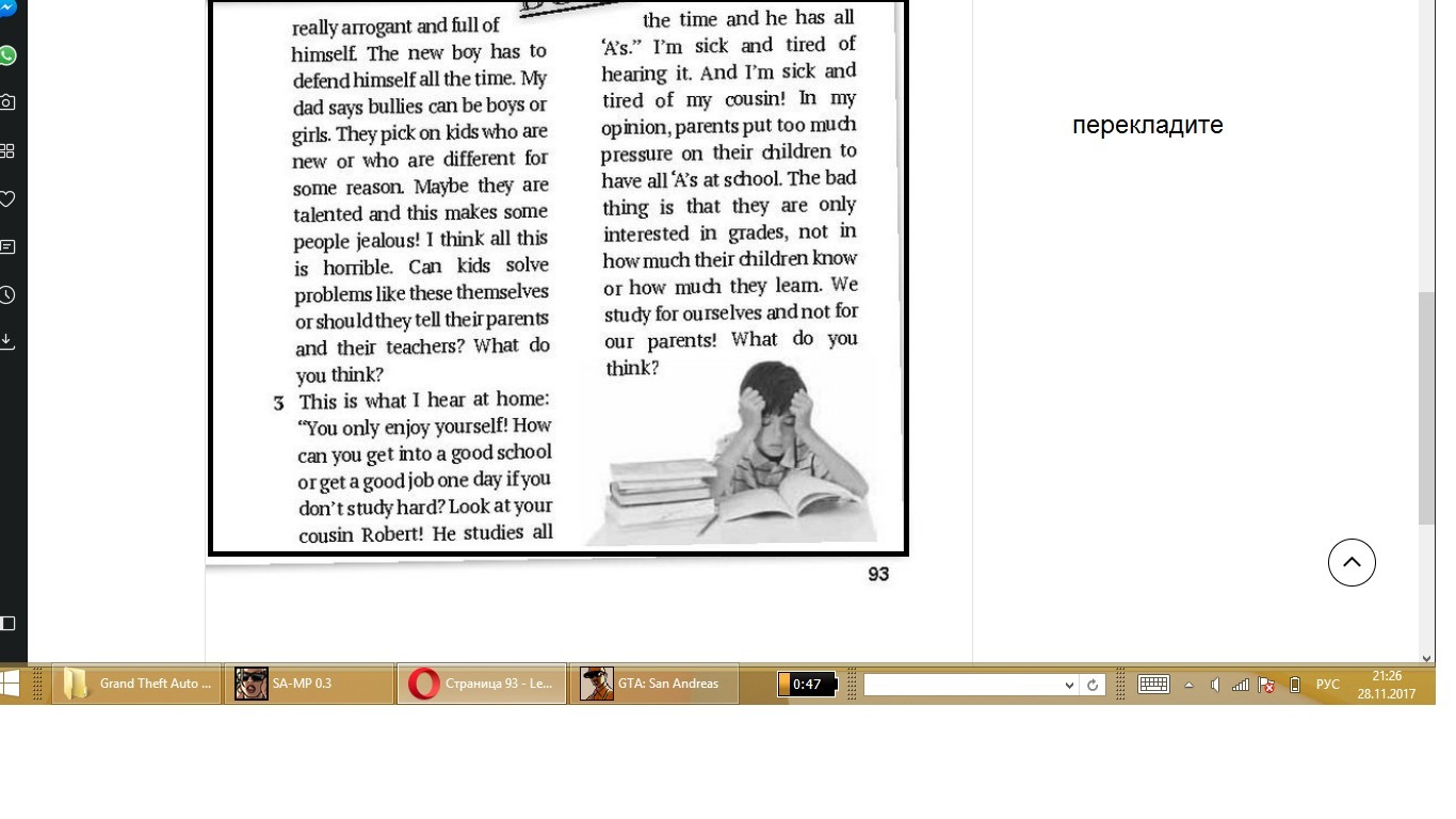 1 Більшість моїх однокласників мають мобільні телефони. Я сама не маю. Вони не приносять свої телефони до школи. Вони не можуть використовувати телефони під час заняття, але іноді вони надсилають та отримують повідомлення, щоб вони не могли зосередитися на уроці. Коли вчителі помічають, що вони дуже засмучені, вони відправляють їх директору, вони конфіскують телефон, і вони дають нам усі лекції. Яка трата часу та енергії! Найгірше, коли дзвонить телефон! Що ти думаєш? 2 У нас є новий хлопчик у своєму класі Він тихий і добре, але деякі люди йому жахливі, особливо цей хлопець, який є