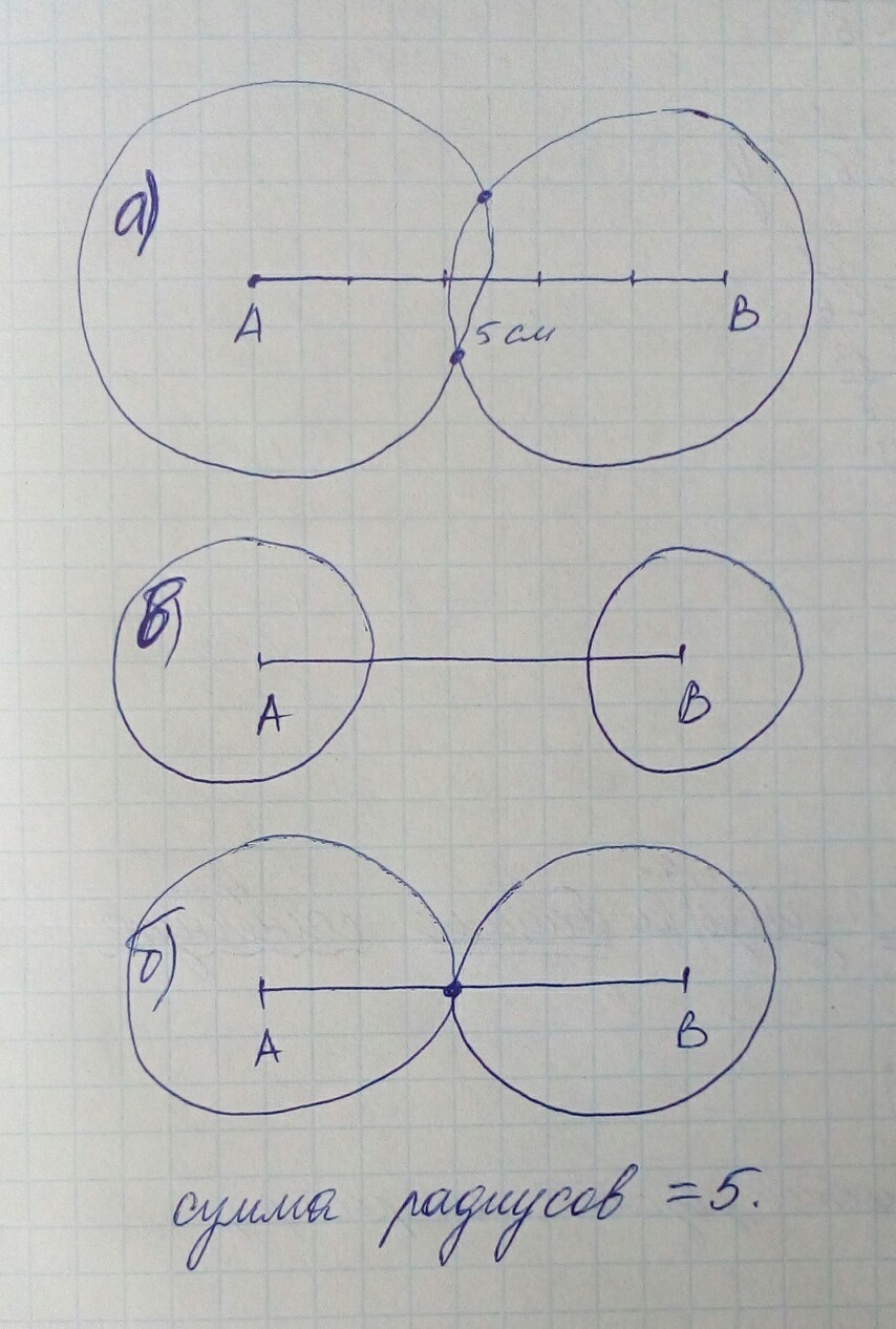 построй это все с помощью линейки и циркуля. сумма радиусов окружностей будет равна 5 (в ответах под буквой а,б), то есть как длина отрезка.
