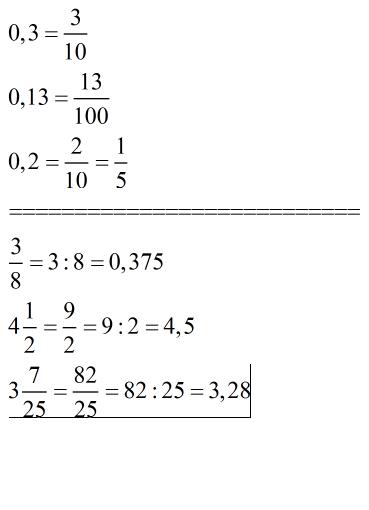 Представте в виде обыкновенной дроби числа 0,3; 0,13; 0,2 и в виде десятичной дроби три восьмых, четыре целых одна вторая, три целых семь двадцатьпятых.