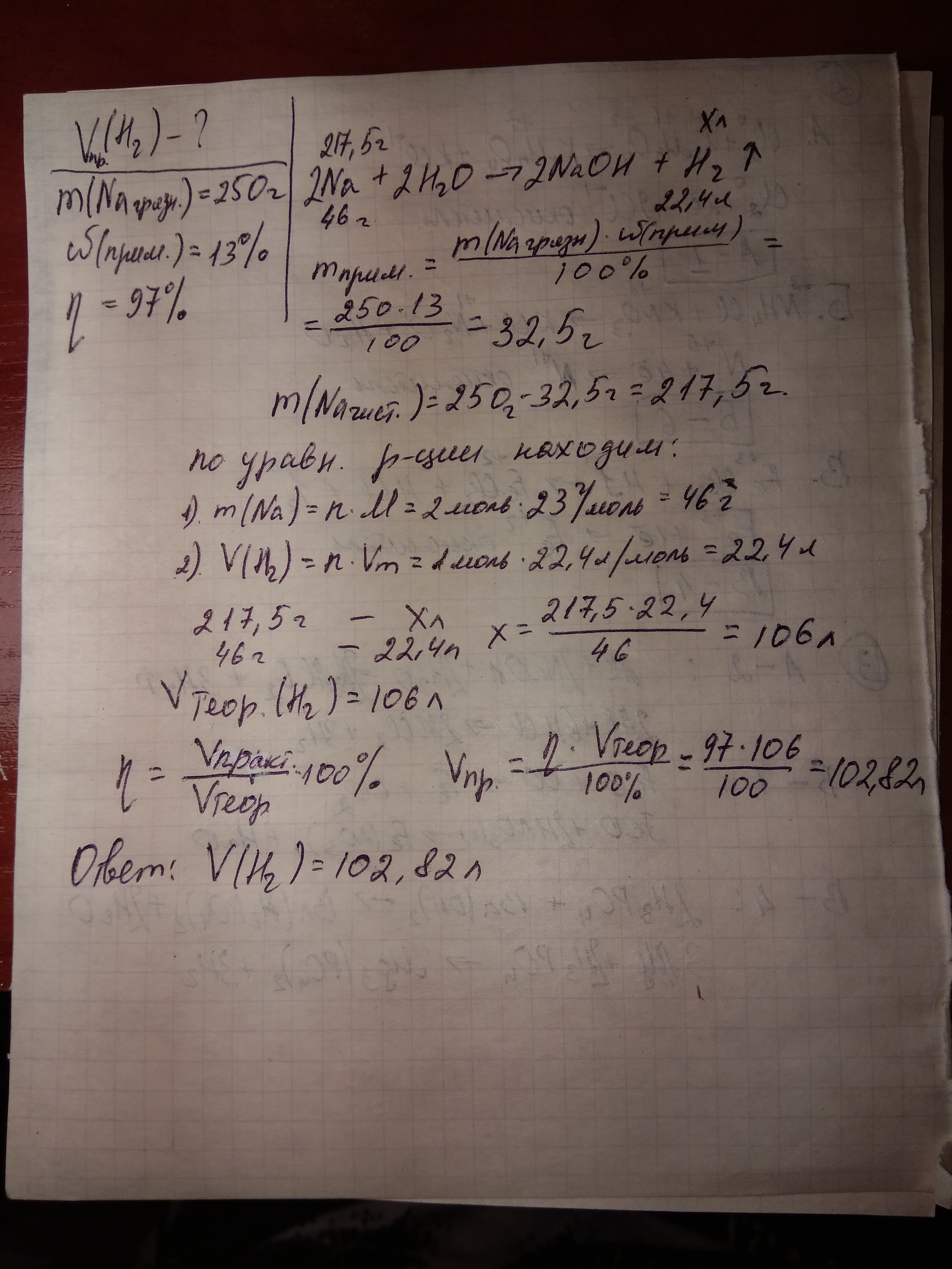 Сколько литов водорода выделится при взаимодействии с водой 250г натрия, содержащего 13% примесей, если выход водорода составляет 97%?