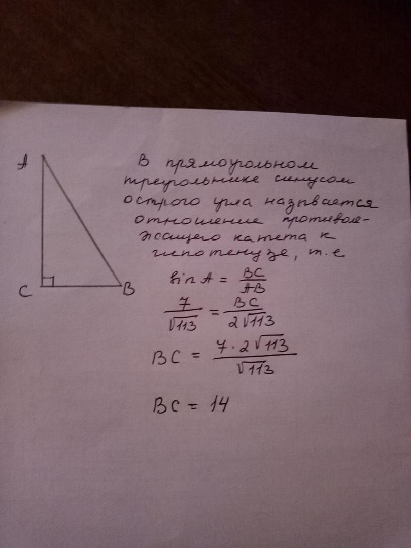В прямоугольном треугольнике ABC найдите длину катета BC, если sin A= 7/√113, длина гипотенузы AB=2√113.