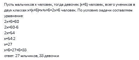 x- число мальчиков, (x+6)-число девочек. составляем уравнение: x+x+6=60; x+x=60-6; 2x=54; x=54/2=27(мальчиков), 27+6=33(девочек). Ответ: 27 мальчиков, 33 девочки.