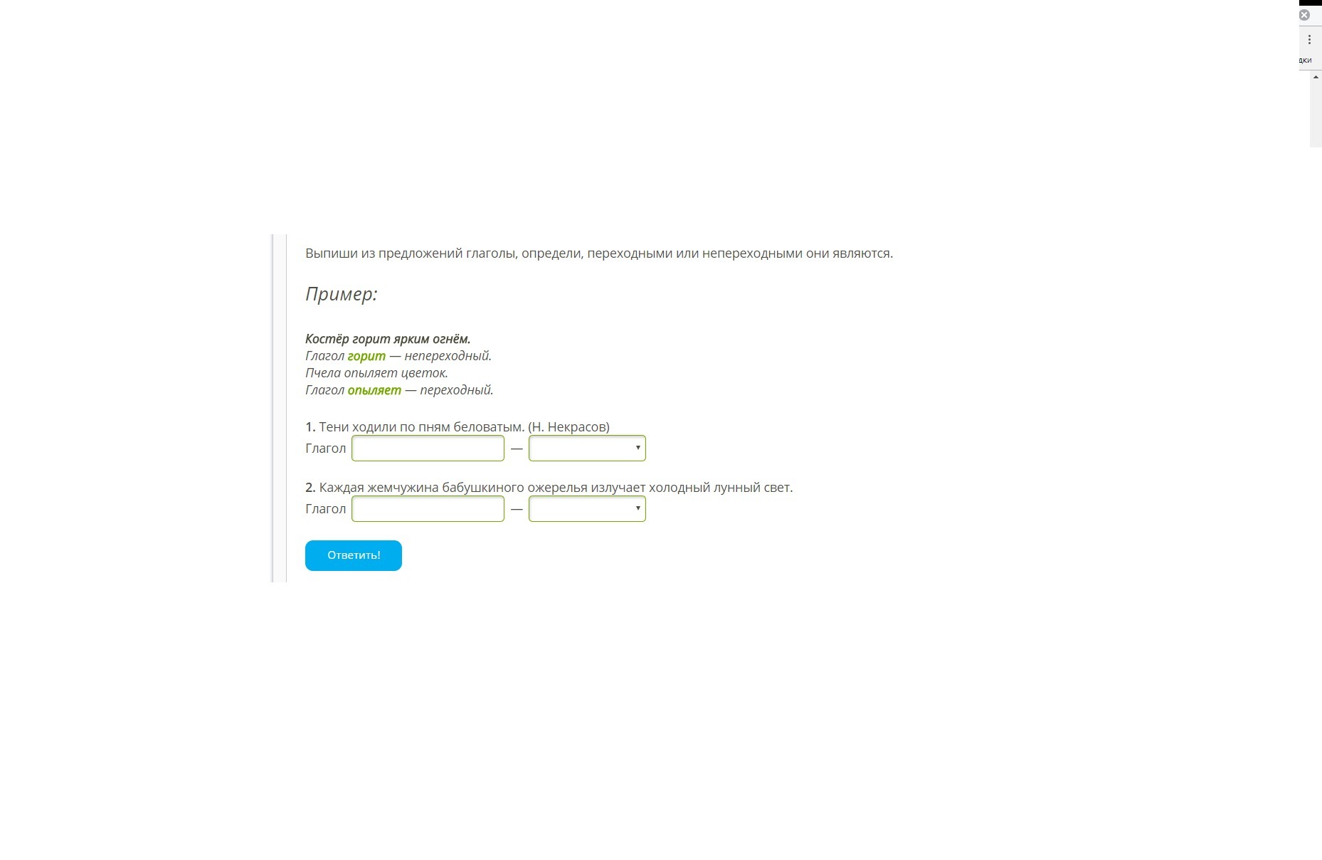 Выпиши из предложений глаголы, определи, переходными или непереходными они являются.