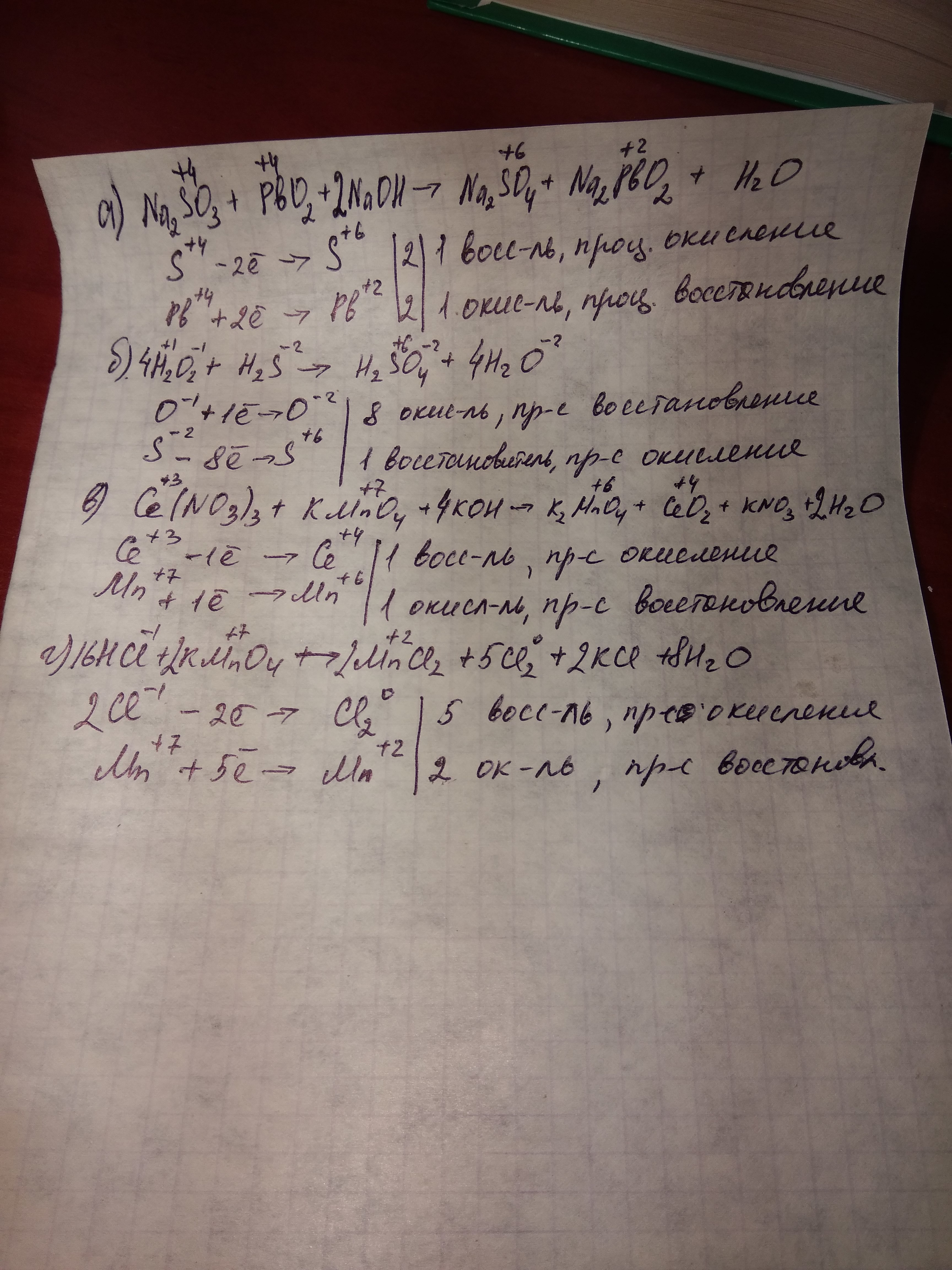 Уравняйте приведённые реакции методом электронного баланса, укажите окислитель и восстановитель, процессы окисления и восстановления, тип ОВР: а) Na2SO3 + PbO2 + NaOH → Na2SO4 + Na2PbO2 + H2O; б) H2O2 + H2S → H2SO4 + H2O; в) Ce(NO3)3 + KMnO4 + KOH → K2MnO4 + CeO2 + KNO3 + H2O; г) НСl + KMnO4 → MnCl2 +Cl2 + KCl + H2O