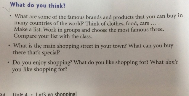 Как вы думаете? Каковы некоторые из известных брендов и продуктов, которые вы можете купить во многих странах мира? Подумайте о одежде, еде, автомобилях. Составьте список. Работайте в группах и выбирайте самые известные три. Сравните ваш список с классом. Какая главная торговая улица в вашем городе? Что вы можете там купить? Вам нравится шоппинг? Что вам нравится делать? Что вам не нравится?(это перевод)