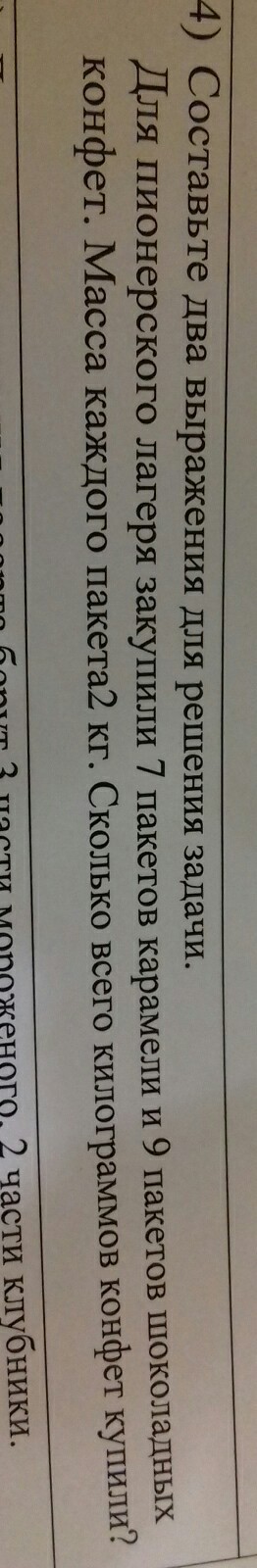 Помогите пожалуйста! Для пенсионерского лагеря закупили 7 пакетов карамели и 9 пакетов шоколадных конфет. Масса каждого пакета 2 кг. Сколько всего килограммов конфет купили? Составь два выражения для решения задачи