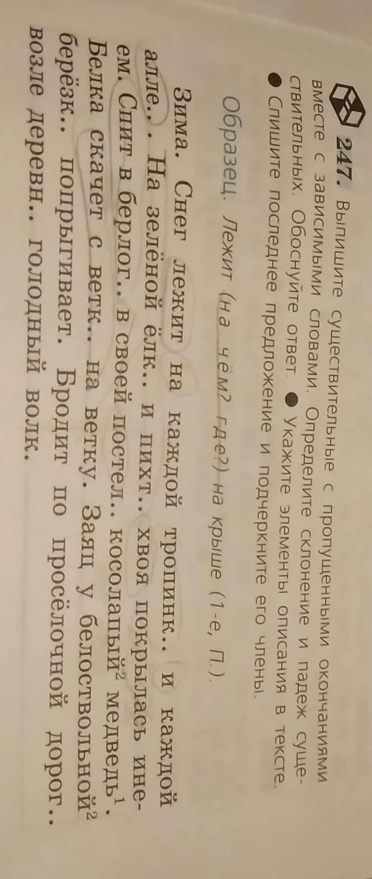 Зима. Снег лежиь на каждой тропинке (1 скл., П.п) и каждой аллее (1 скл., П.п.) На зеленой елке (1 скл., П.п.) и пихте (1 скл., П.п.) хвоя покрылась инеем. Спит в берлоге (1 скл., П.п.) в своей постели (3 скл., П.п.) косолапый медведь. Белка скачет с ветки (1 скл., Р.п.) на ветку. Заяц у белоствольной березки (1 скл., Р.п.) попрыгивает. Бродит по проселочной дороге (1 скл., Д.п.) возле деревни (1скл., Р.п.) голодный волк.