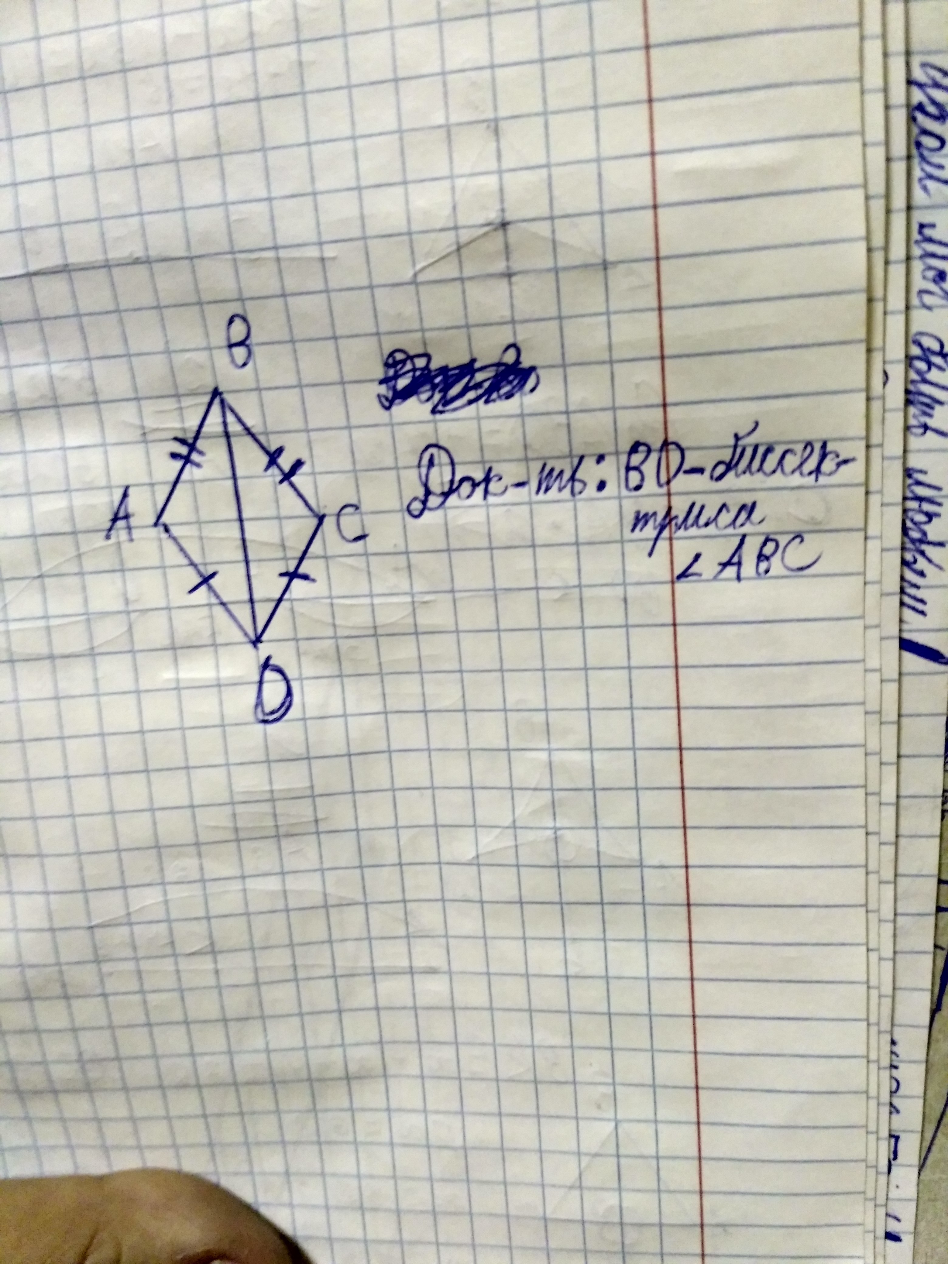 Мы сможем доказать, что БД является биссектрисой угла АБЦ следующим образом: АБЦД - это ромб, если провести вторую диагональ АЦ, то получится два одинаковых равнобедренных треугольника. Мы знаем, что линия, опущенная из вершины равнобедренного треугольника является и высотой, и медианой, и биссектрисой. И, т.к. у нас тоже равнобедренный треугольник, то БД является биссектрисой и делит угол АВЦ на 2 равные части.