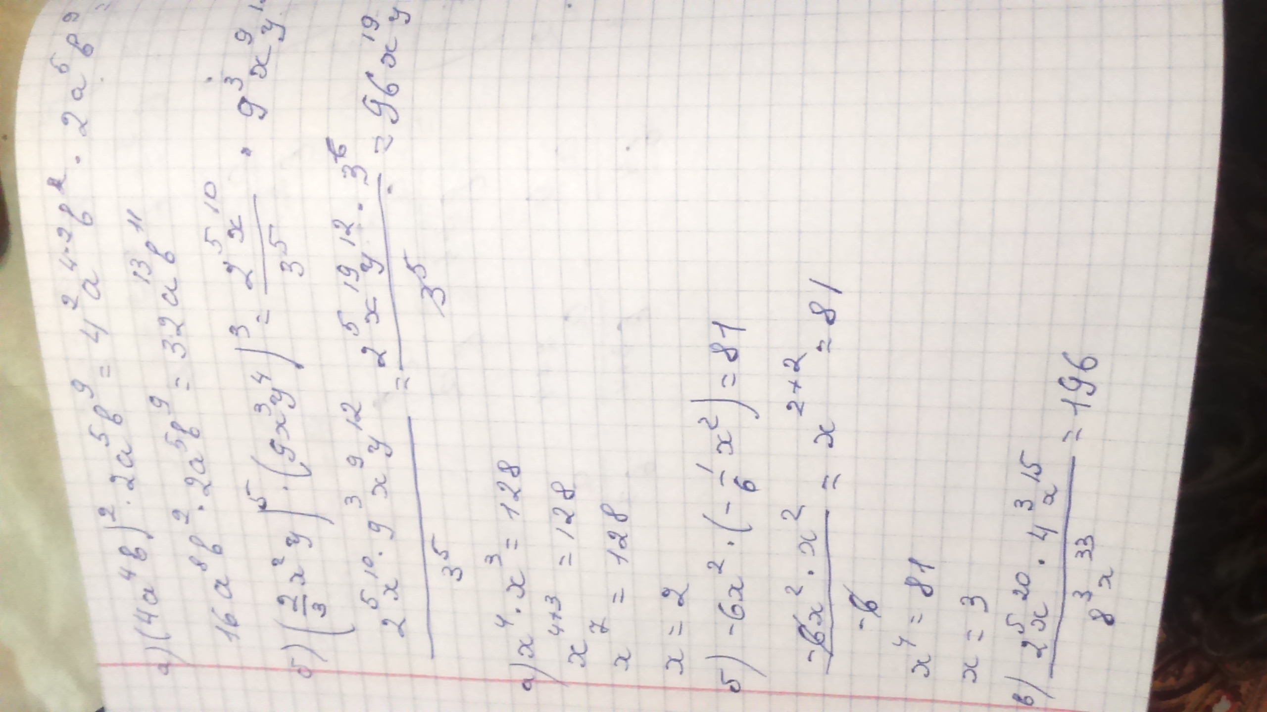 ну смотри, в первой скобке каждое число или букву возводишь в нужную степень то есть 4 во вторую степень,потом а^4 во вторую степень ,при умножении степень на степень цифры перемножаются , то есть будет а в степtни 4*2 =а^8 b и остаётся b ,b тоже в квадрат,получаем 16a^8b^2 дальше мы это умножаем на 2 a^5b^9,действуем так : 16*2=32