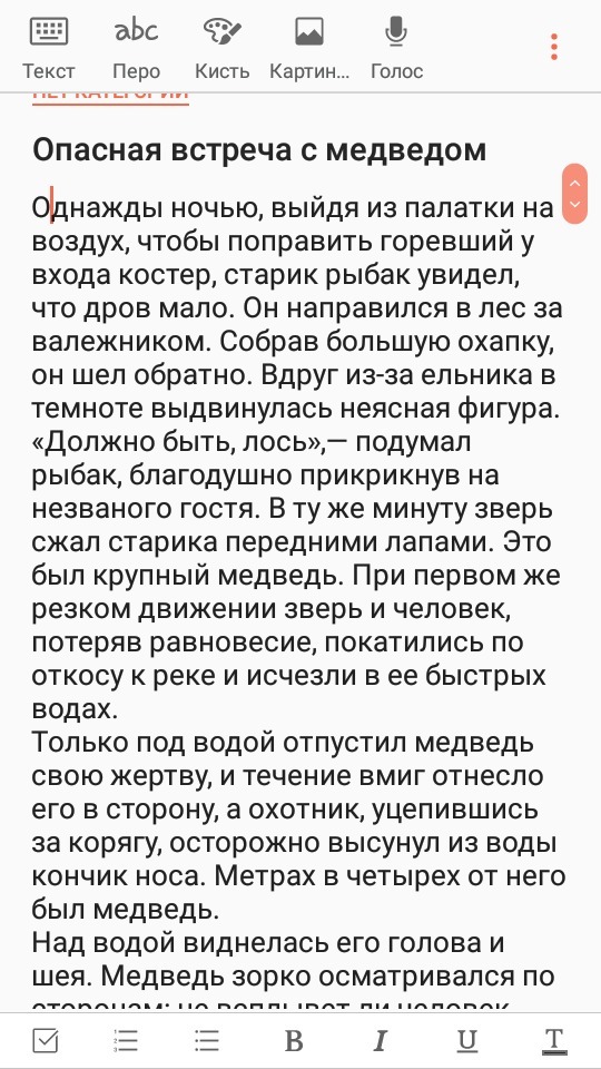 Однажды ночью вышел рыбак дров набрать, пришел и видет что то в кустах двигается, думает что лось. Вдруг зверь сжал в кулаках человаека, это был медведь. При первом движении они покатились в сторону реки.