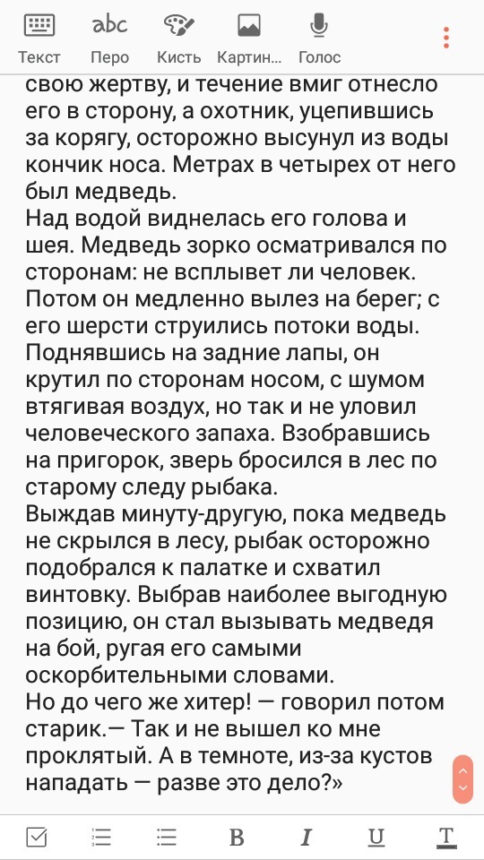 Над водой виделась его голова и шея.Потом он медленно вылез на берег:с его шерсти текла ручьем вода.Вставшим на задние лапы он стал крутить носом. Подождал минуту пока ушёл медведь и взял винтовку. Выбрав наиболее лучшую позицию он стал выманивать медведя ,,Разве честно из за кустов наподать"