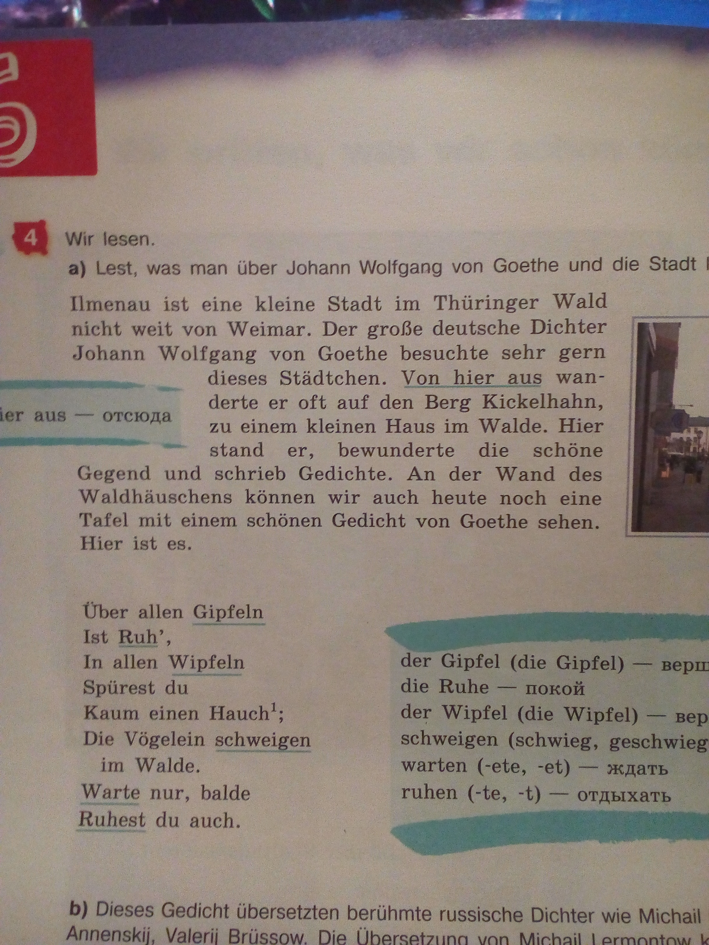Ильменау это маленький город в Тюрингском лесу недалеко от Веймара.. Великий немецкий поэт Йоган Вольфганг фон Гете посещал очень охотно этот городок. Отсюда брел (шел пешком ) он часто на гору Кикельхан, к одному маленькому дому в лесу. Здесь стоял он, восхищался прекрасной местностью и писал стихи. На стене лесного домика можем мы также сегодня еще доску с прекрасным стихом Гете увидеть. Тут написано.