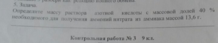 Определите массу раствора азотной кислоты с массовой долей 40% необходимого для получения аммоний нитрата из аммиака массой 13,6г