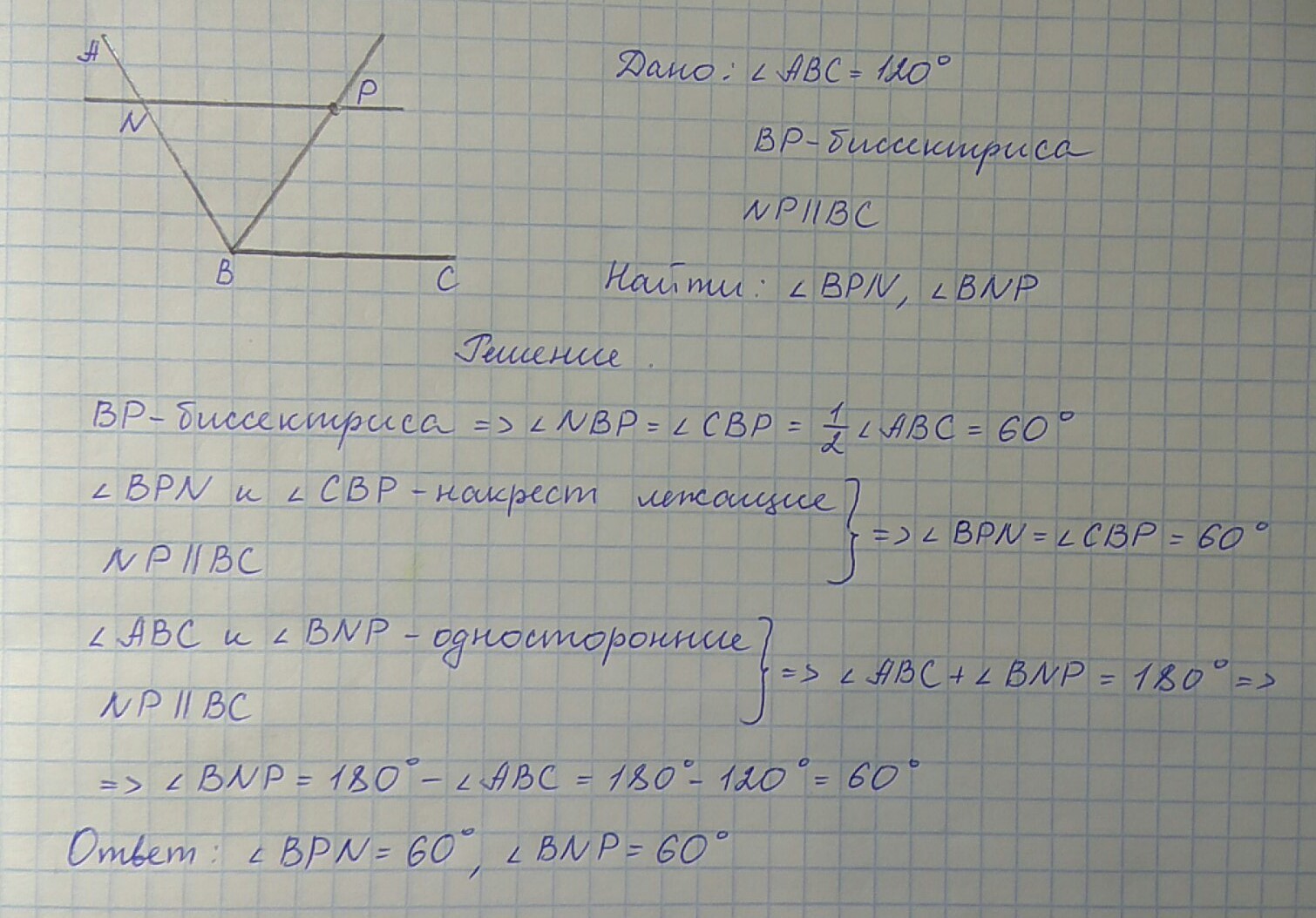 На биссектрисе угла ABC отметили точку P и через неё провели прямую,параллельную стороне BC. Эта прямая пересекла сторону BA в точке N. Найдите углы BPN и BNP,если угол ABC=120 градусов