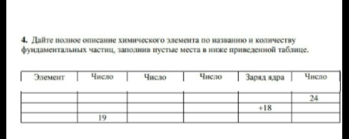 дайте полное описание химического элемента по названию и количеству фундаментальных частиц заполнив пустые места в ниже приведённой таблице