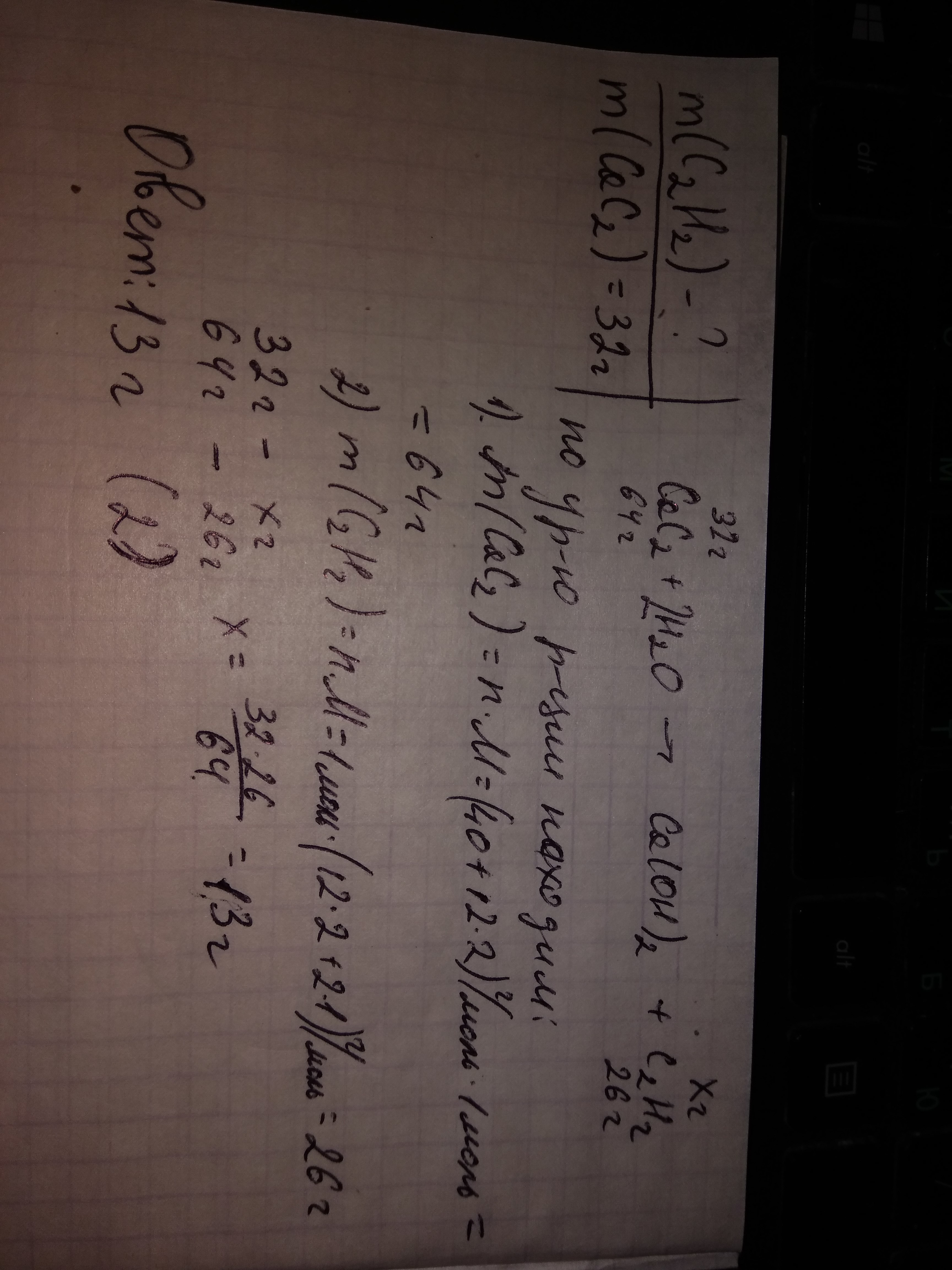 масса ацетилена выделившегося в результате гидролиза 32г карбида кальция равна: