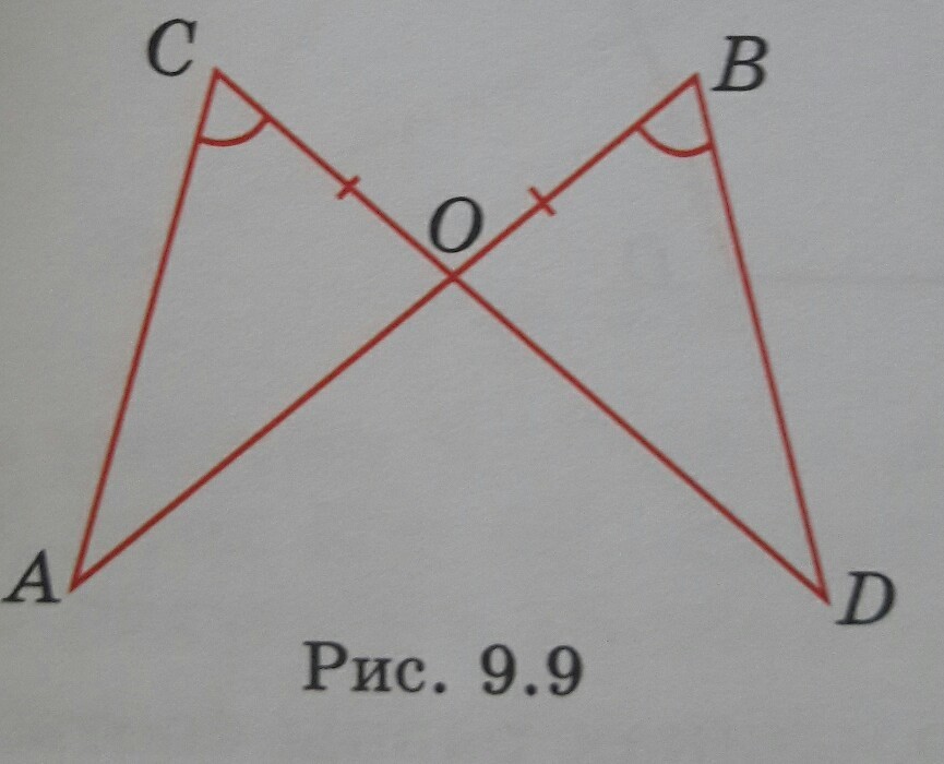 На рисунке 9.9 отрезки АВ и СD пересекаются в точке О , ОВ=ОС и угол В равен углу С. Докажите равенство треугольников АОС и DOB.