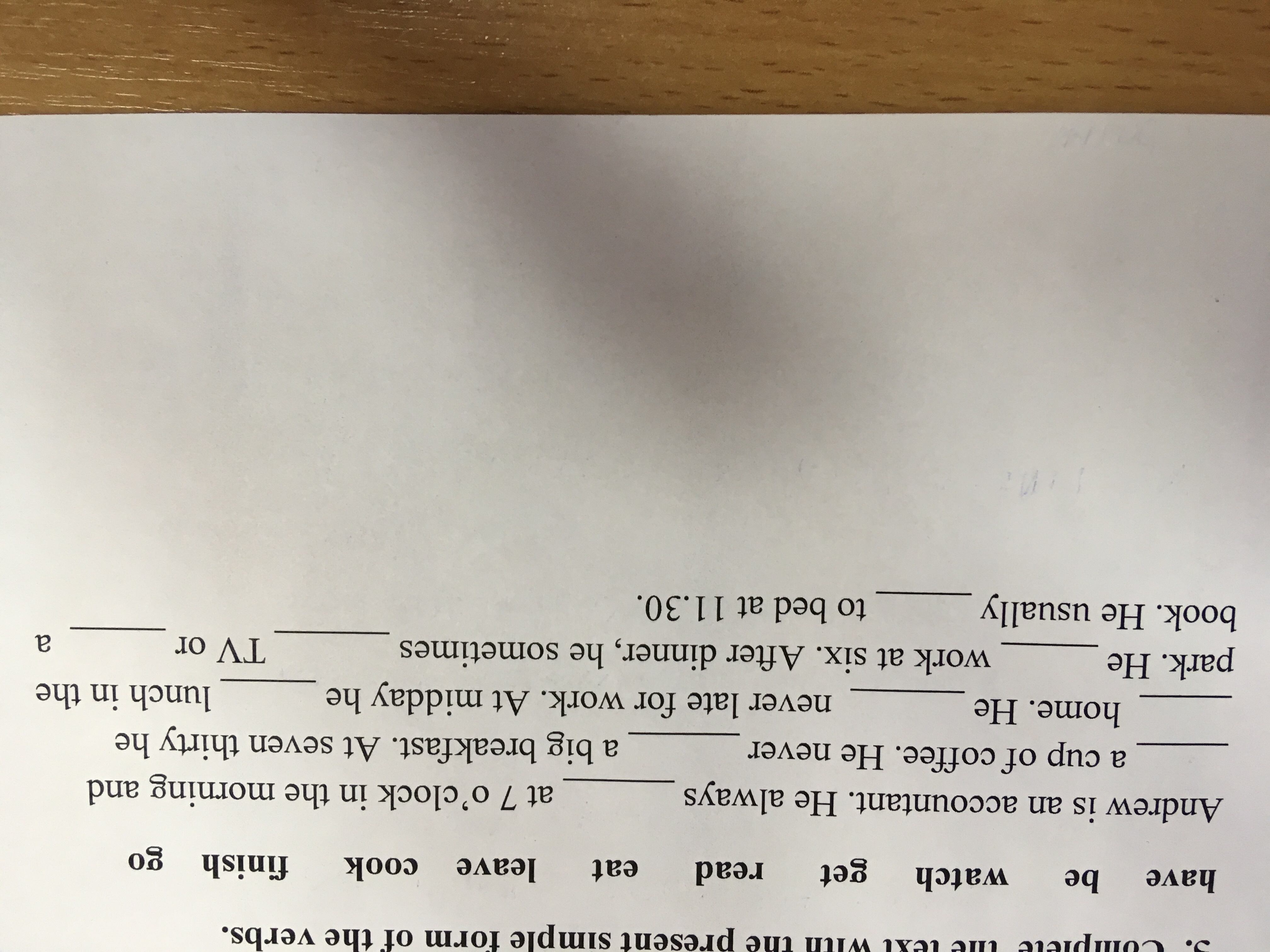 Andrew is an accountant. He always gets up at 7 o'clock in the morning and has a cup of coffee. He never cooks a big breakfast. At seven thirty he left home. He is never late for work. At midday he has lunch in the park. He finishes work at six . After dinner, he sometimes watches TV or reads a book. He usually goes to bed at 11.30.
