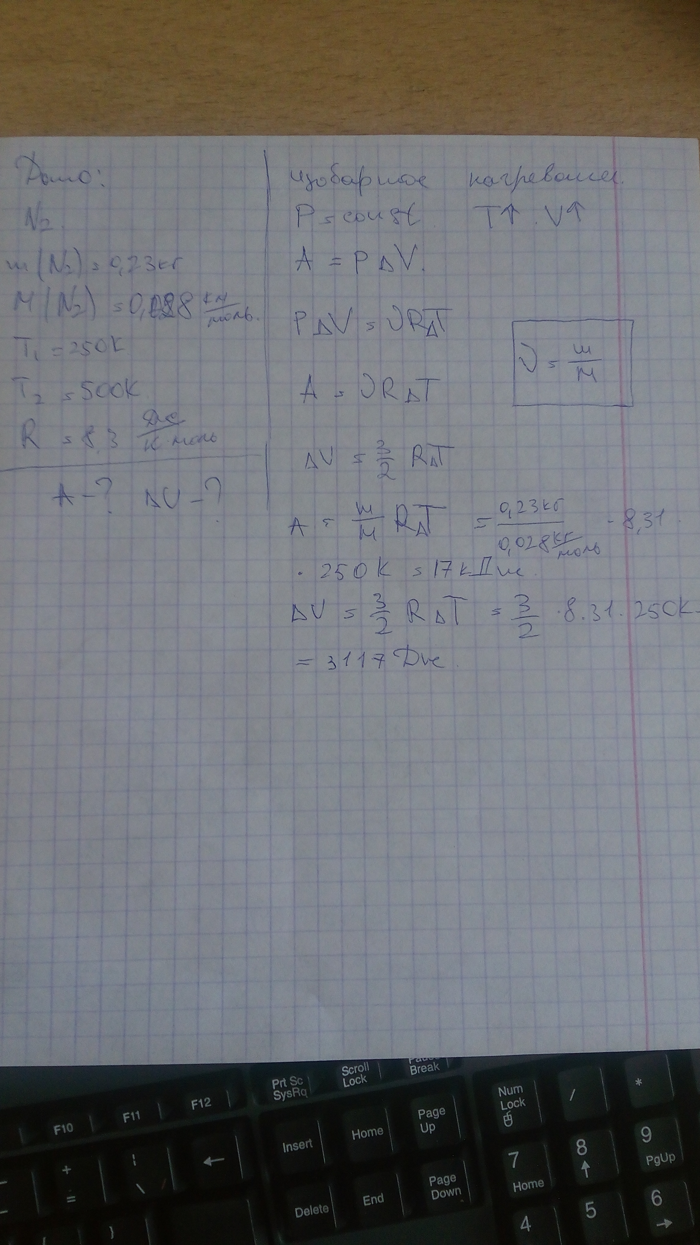 Масса азота 0,23 кг. Его нагревают изобарно от T1=250 К ДО T2=500К. Найти работу при наргевании и изменение внутреней Энегрии