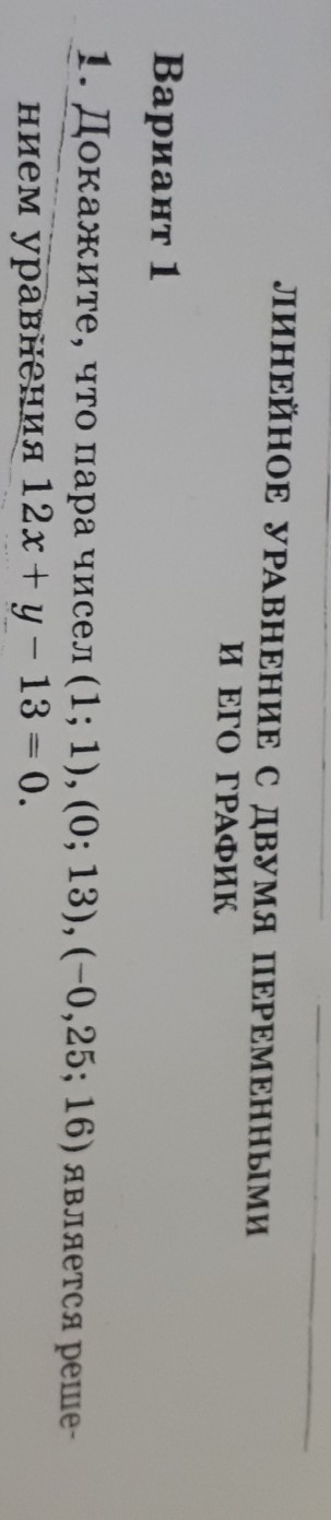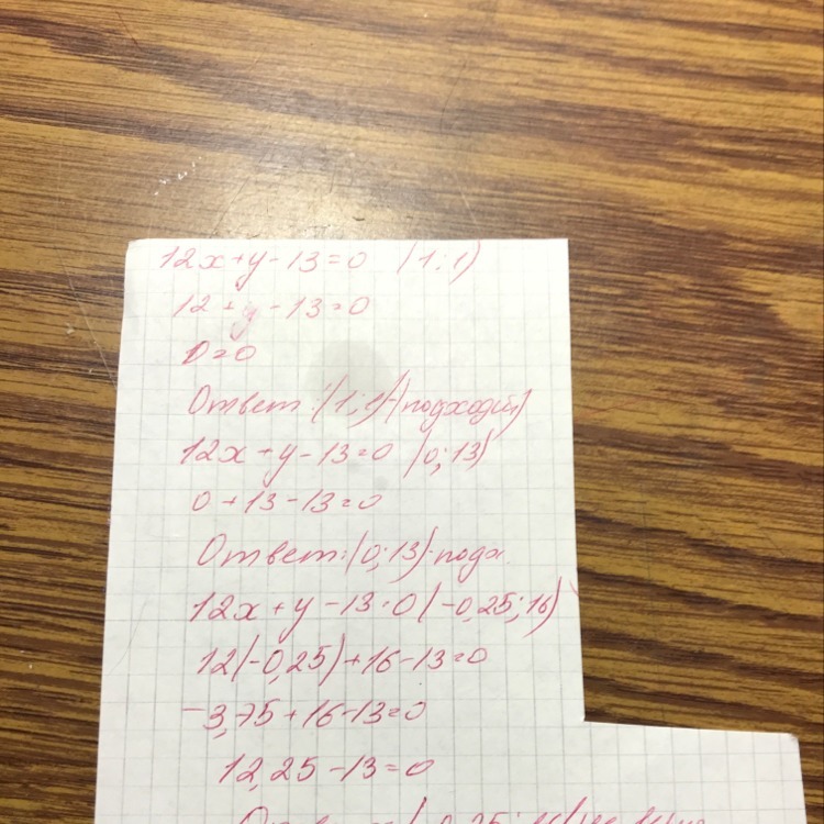 докажите что пара чисел(1;1),(0;13).(-0,25;16) является решением уравнения 12х + у -13 =0
