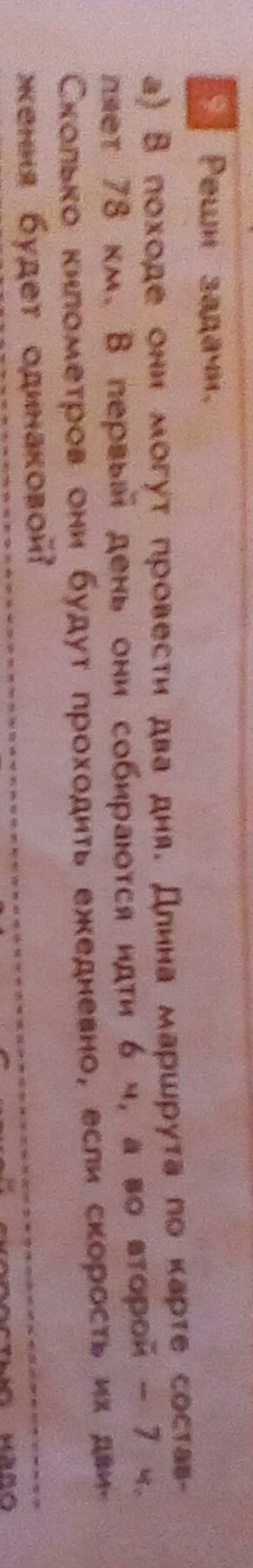 в походе они могут провести два дня.длина маршрута по карте состовляет 78 км.в первый день они собираются идти 6 ч,а во второй 7 ч.сколько километров они и будут ежедневно, если скорость их движения будет одинаковой? Задача
