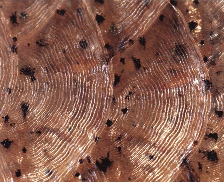 На чешуйках хорошо заметны концентрические кольца. Они соответствуют росту чешуи зимой (узкие кольца) и летом (широкие) . Таким образом, по количеству колец на чешуе рыбы можно определить ее возраст.